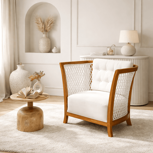يتميز كرسي الاسترخاء مارثا بإطار متين من خشب الساج مقترن بزهرة النيل المنسوجة بشكل جميل، مما يوفر مظهرًا طبيعيًا وراقيًا للمساحات الداخلية أو الخا...