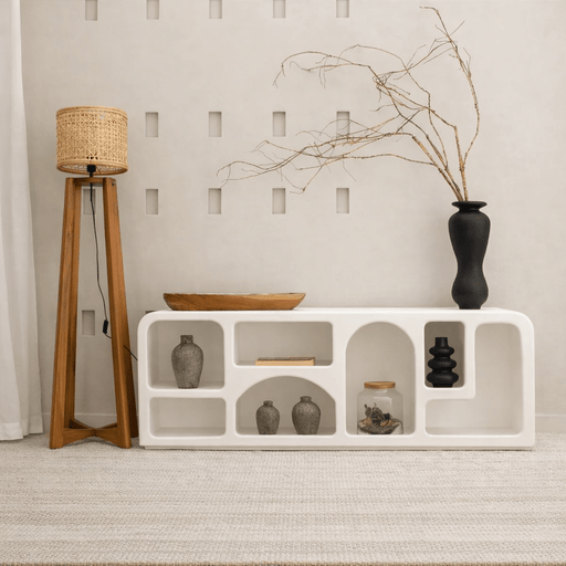 أضف لمسة جمالية إلى مساحتك مع رف الكتب "إيزابيل"، تحفة فنية مستوحاة من الطراز المتوسطي. يضفي سطحه الأبيض ذو الملمس المميز ورفوفه التي تُشبه الكهوف...