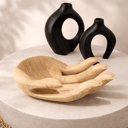 صينية اليد اليمنى قطعة فنية رائعة مصنوعة يدويًا، على شكل يد مفتوحة أنيقة، ومصنوعة من خشب الألبازيا الطبيعي. تتميز كل صينية بنقوش حبيبات الخشب الفر...