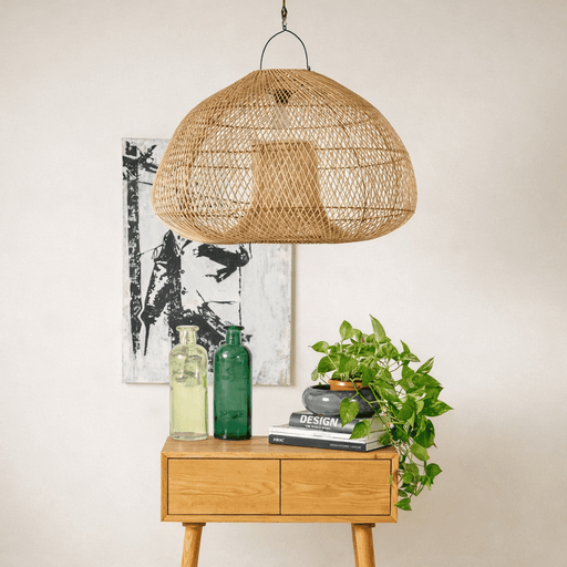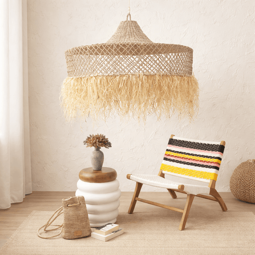 أضف لمسة دافئة وطبيعية إلى مساحتك مع هذا المصباح المعلق المصنوع يدويًا من ألياف الموز. تصميمه العضوي وألوانه الترابية تخلق توهجًا ناعمًا ومريحًا، م...