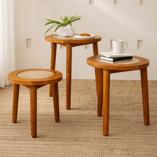 The Mansur Round Side Tables Set: a harmonious fusion of rattan tops and teak wood frames. These tables exude durability and natural allure, seamle...