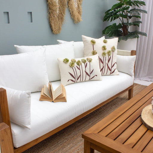 The Cassandra Sofa boasts a teak wood frame with rattan side panels and is upholstered in a soft custard-colored fabric. Complete with cushioned se...