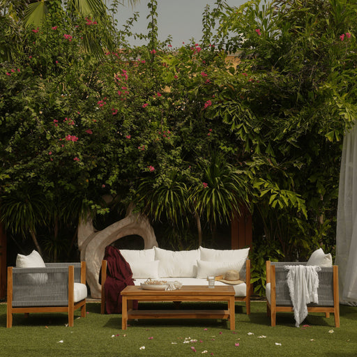 The Tahiti Sofa Set: a stylish outdoor ensemble including a sofa, two chairs, and a coffee table. Crafted from natural teak wood with gray rope arm...