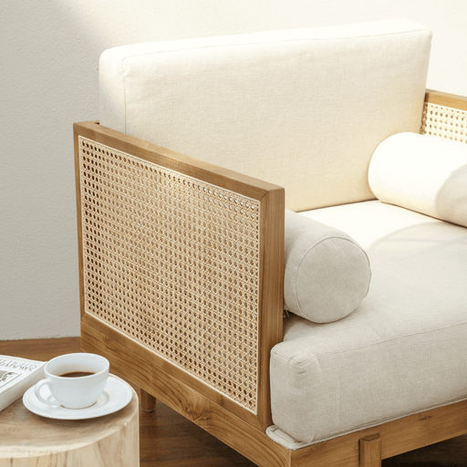The Cassandra Sofa boasts a teak wood frame with rattan side panels and is upholstered in a soft custard-colored fabric. Complete with cushioned se...