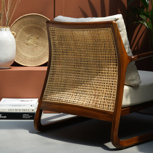 Bring a touch of comfort and style to your living room with this solid teak frame armchair. The chair features a beautiful curved natural rattan ba...
