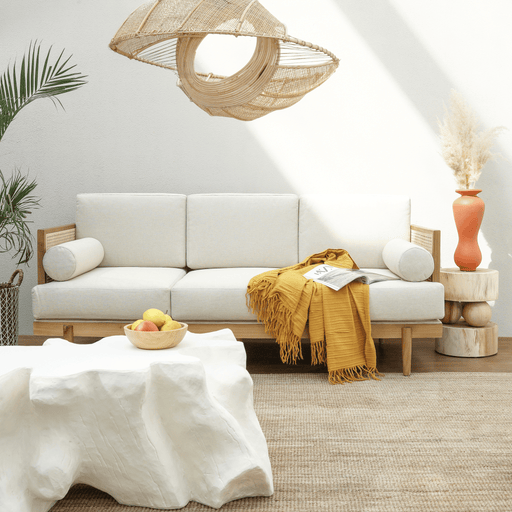The Eloisa Sofa blends a classic teak wood frame with distinctive rattan side panels. It features plush custard-colored cushions for the seat and b...